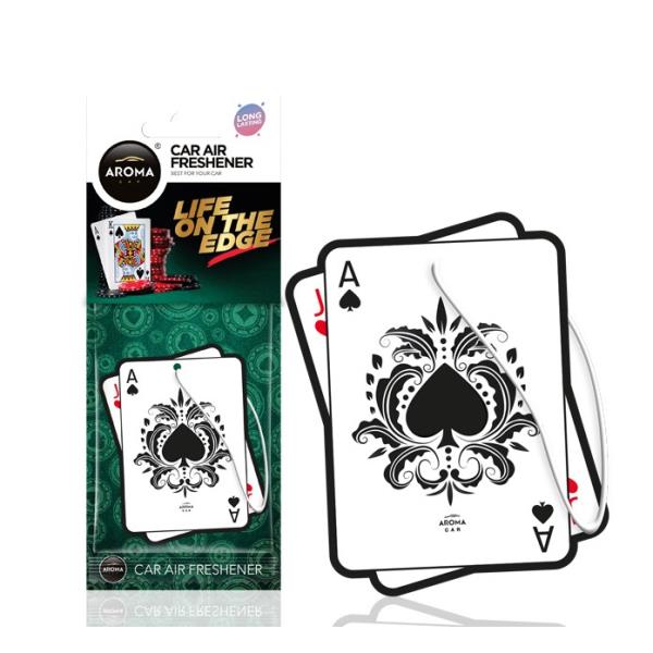 Celulozowy odświeżacz powietrza dla fanów gier przy zielonym stoliku. Przenieś się do Las Vegas, dzięki zapachowi hazardu, który poczujesz w tych zawieszkach. Należy tylko zawiesić detal celulozowy na lusterku wewnątrz samochodu przy użyciu gumki.