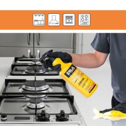 Działa szybko i efektywnie, nie pozostawiając smug ani zacieków. Doskonale radzi sobie z tłustymi i olejowymi zabrudzeniami na blatach, okapach, płytkach, sprzętach kuchennych i gastronomicznych – w tym na płytach indukcyjnych, elektrycznych i gazowych – a także na odzieży. Rewolucyjna formuła pozwala usunąć nawet najbardziej zaschnięty brud. Przyjemny, świeży zapach sprawia, że sprzątanie staje się nie tylko skuteczne, ale i bardziej komfortowe.