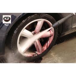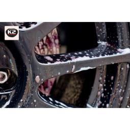 K2 ROTON 5L w spektakularny sposób usuwa wszelkie uporczywe zabrudzenia, w tym osad z klocków hamulcowych i zabrudzenia drogowe, czego efektem jest zabarwienie naniesionego płynu na czerwono. Mycie felg za pomocą płynu jest szybkie, efektywne i skuteczne i nie wymaga wysiłku. Brud jest usuwany bez ryzyka zarysowania czyszczonej powierzchni.