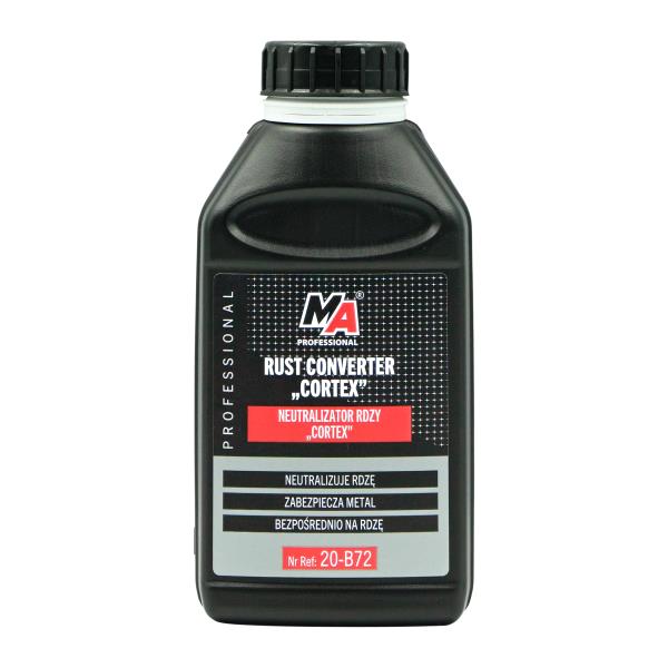 MOJE AUTO MA PROFESSIONAL NEUTRALIZATOR RDZY CORTEX 500ml. Wysokiej jakości neutralizator rdzy hamujący rozwój korozji. Po nałożeniu na skorodowaną powierzchnię zmienia aktywna rdzę w stabilny neutralny materiał zabiegając trwałemu uszkodzeniu elementu. Jeżeli przedmiot narażony jest na zewnętrzne warunki atmosferyczne pokrytą neutralizatorem rdzy powierzchnię należy dodatkowo zabezpieczyć lakierem / farbą.