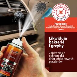Skuteczny preparat do dezynfekcji nawiewów i systemów klimatyzacji w pojazdach. Usuwa nieprzyjemne zapachy spowodowane zaleganiem zanieczyszczeń i wilgocią zapewniając świeżość w pojeździe. Eliminuje bakterie i grzyby. Odświeża wnętrze samochodu. Substancje zawarte w preparacie działają skutecznie już po 15 minutach.