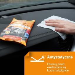 Nasączone ściereczki do kokpitu to produkt gotowy do użycia, który można stosować na wszystkie plastykowe oraz winylowe powierzchnie. Moje Auto Ściereczki do kokpitu – matowe nasączone zostały specjalnym preparatem czyszczącym i pielęgnującym matowe powierzchnie. Skutecznie usuwają kurz oraz inne zabrudzenia, wykazując przy tym właściwości antystatyczne. Są bezpieczne i wygodne w użytkowaniu, a dzięki specjalnemu opakowaniu na długo zachowują wilgotność. Pozostawiają przyjemny, cytrusowy aromat.