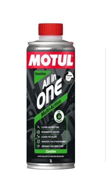 MOTUL® ALL IN ONE GASOLINE to kompletny, wielofunkcyjny, leczniczy środek czyszczący do wszystkich typów silników benzynowych, z układami wtryskowymi lub gaźnikami, wolnossących lub turbodoładowanych, z katalizatorem lub filtrem cząstek stałych lub bez, wykorzystujących wszystkie rodzaje paliw benzynowych, ołowiu lub benzyna bezołowiowa, etanol, LPG i biopaliwa. MOTUL® ALL IN ONE GASOLINE to dodatek do benzyny kompatybilny z paliwami E10 (etanol 10%). MOTUL® ALL IN ONE GASOLINE skutecznie czyści osady i zanieczyszczenia powstałe w pracy wtryskiwaczy i układów dostarczania paliwa silnika dzięki swoim wielozadaniowym właściwościom leczniczym, ograniczając w ten sposób: zabrudzenie dyszy wtryskiwacza, kondensację w układzie paliwowym, zażółcenie wtryskiwacza lub gaźnika. zabrudzenie komór spalania i zaworów dolotowych MOTUL ALL IN ONE GASOLINE zapewnia doskonałe smarowanie podczas procesu czyszczenia i zapobiega osadzaniu się usuniętych mikrocząstek. Usuwając osady i blokady z zaworów, wtryskiwaczy i komór spalania, MOTUL® ALL IN ONE GASOLINE umożliwia mocne spalanie, przywracając wydajność silnika, zmniejszając zużycie paliwa, a tym samym zmniejszając emisję gazów spalinowych i cząstek stałych. Wielofunkcyjny dodatek MOTUL® ALL IN ONE GASOLINE chroni również cały układ paliwowy przed korozją, dzięki czemu idealnie nadaje się do paliw zawierających etanol (E5 i E10).