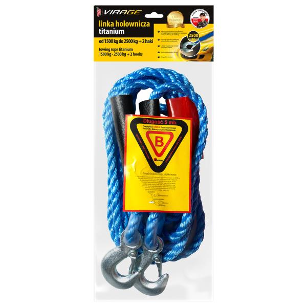 Linka holownicza przeznaczona jest do holowania samochodów na drogach w normalnych warunkach i przy całkowitym ciężarze zgodnym z oznaczeniem produktu. Zgodna z obowiązującymi Warunkami Technicznymi. Linka holownicza przeznaczona do pojazdów samochodowych o DMC od 1500kg do 2500kg. Aż 5 metrów długości.