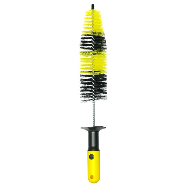 To jest szczotka czyszcząca, idealna do mycia felg samochodowych i trudno dostępnych miejsc. Włókna w kolorach czerwonym i czarnym są wykonane z trwałego, elastycznego tworzywa, które skutecznie usuwa brud i osady. Ergonomiczny uchwyt z ochronnym kołnierzem zapewnia wygodny i bezpieczny chwyt podczas użytkowania. Dzięki swojej konstrukcji szczotka doskonale nadaje się do czyszczenia zakamarków felg, grilli samochodowych oraz innych elementów wymagających precyzyjnego czyszczenia.