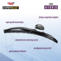 Wycieraczka samochodowa hybrydowa to elementy niskoprofilowe, których pióro jest w całości zasłonięte oraz zintegrowane z ramieniem. Wycieraczki hybrydowe przede wszystkim łączą w sobie zalety wycieraczek szkieletowych oraz bezszkieletowych. Seria HYBRID + 9 adapterów. Opakowanie kartonowe.